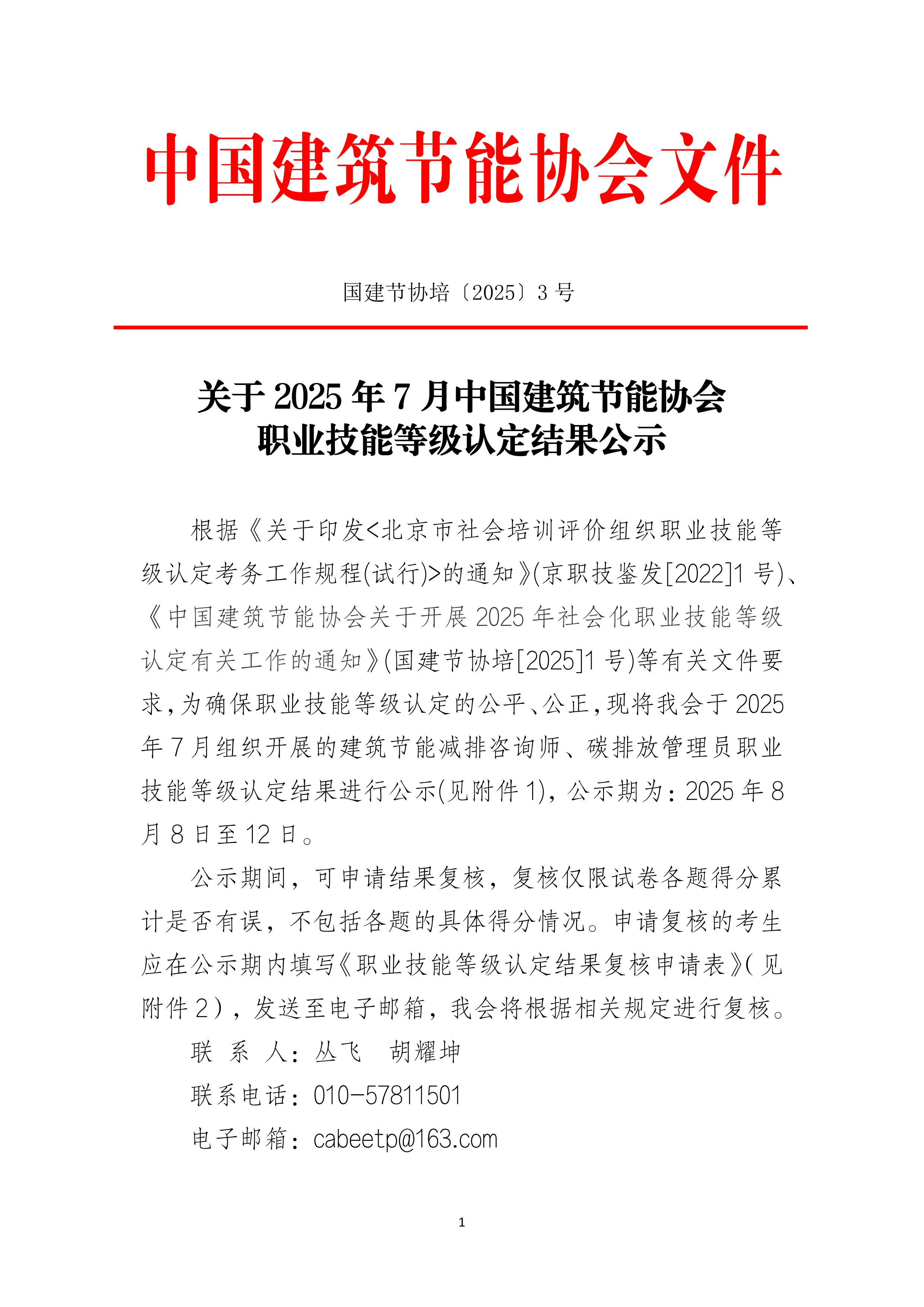 关于2025年7月中国建筑节能协会职业技能等级认定结果公示